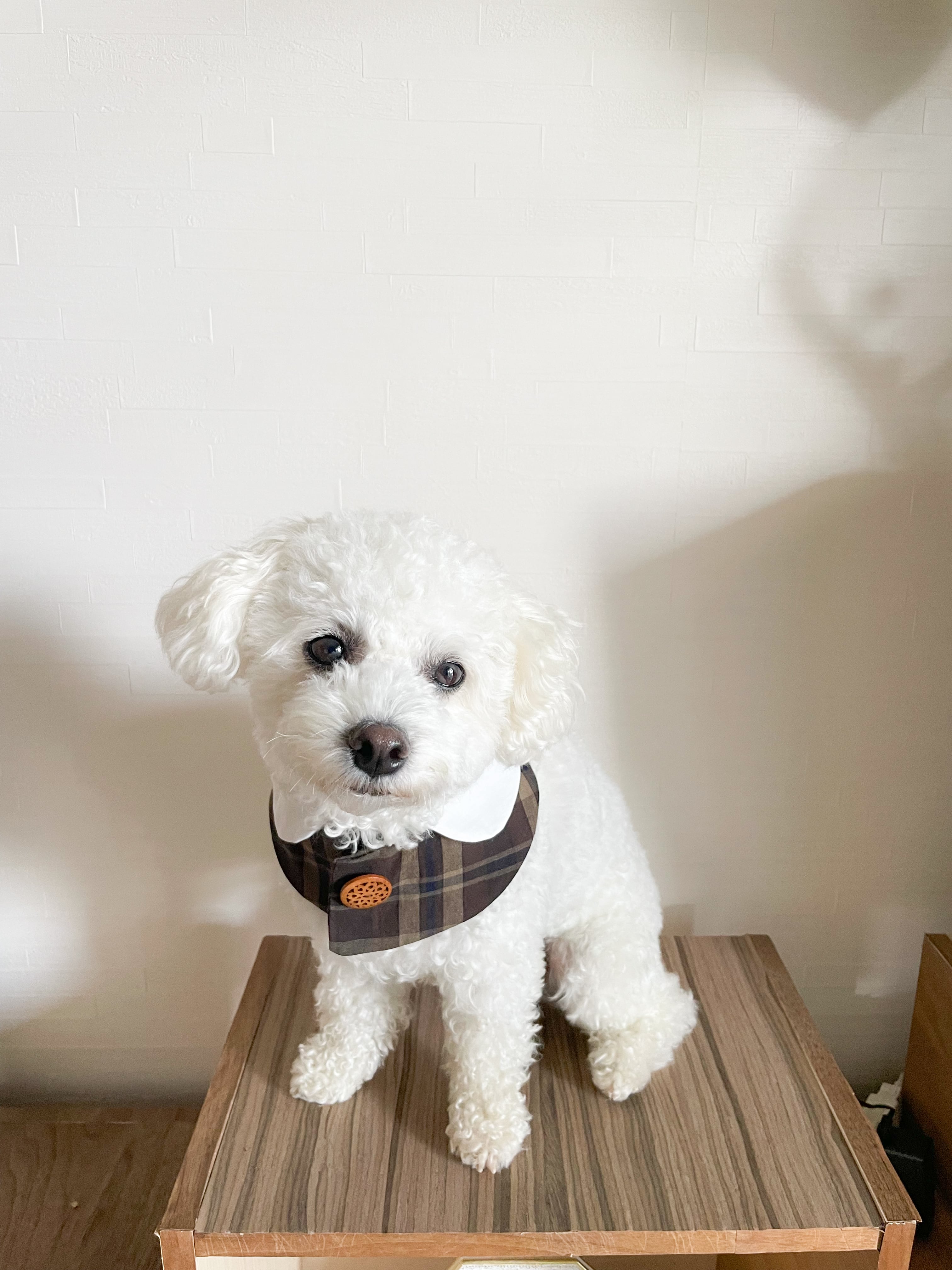 秋らしいブラウンの優しいチェック柄のスタイです。青い線のチェックがおしゃれさを演出しています。